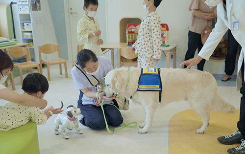 長期入院となる子供たちが多く、スマホで動画を見たり、ゲームをしながら殆どの時間をベッドの上で過ごすことが多かったのですが、aiboがいてくれるとスマホのことを忘れてお世話をしながら楽しく過ごしてくれています。自分が飼っている犬を想い出しながらお世話をしてくれていたり、兄妹がいる子供たちは下の子をお世話するのと同じような感覚で抱っこしたり、撫でてあげたり、ほめてあげたりしながら楽しく笑顔になる時間が増えました。