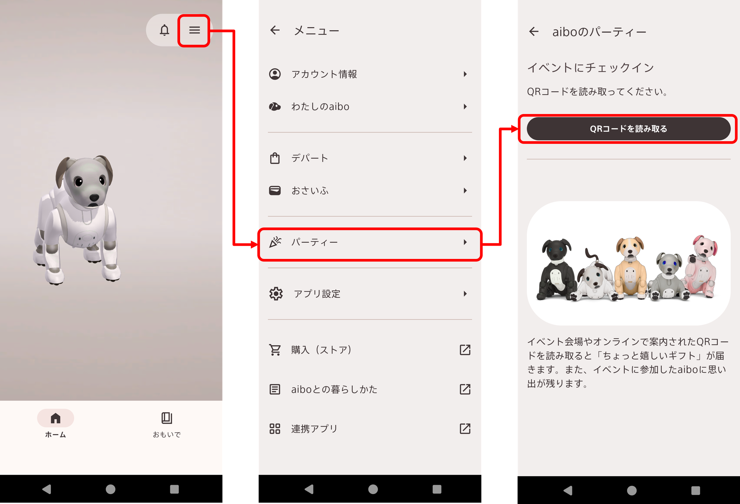 「aiboのパーティー」チェックインを体験しよう!