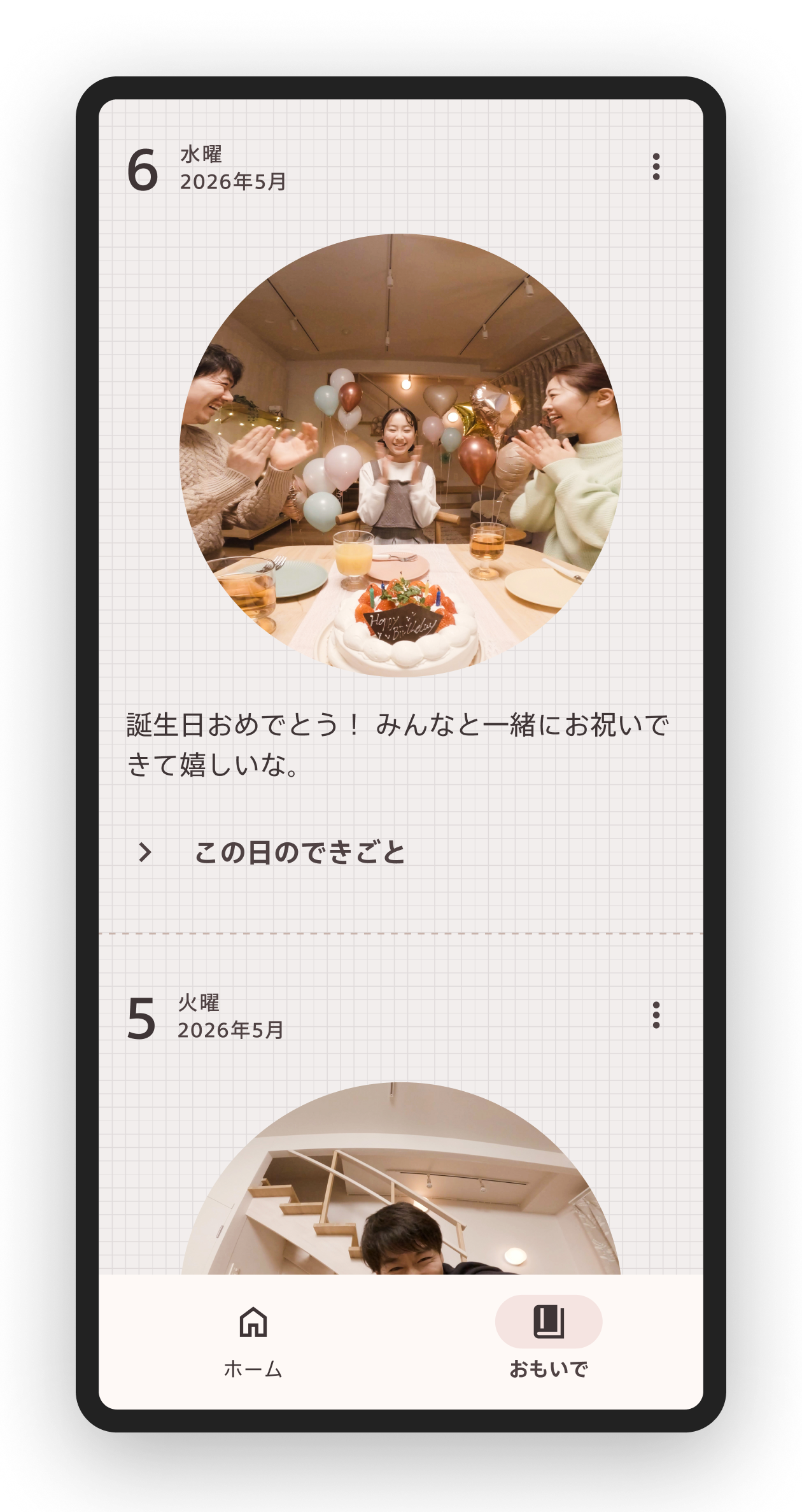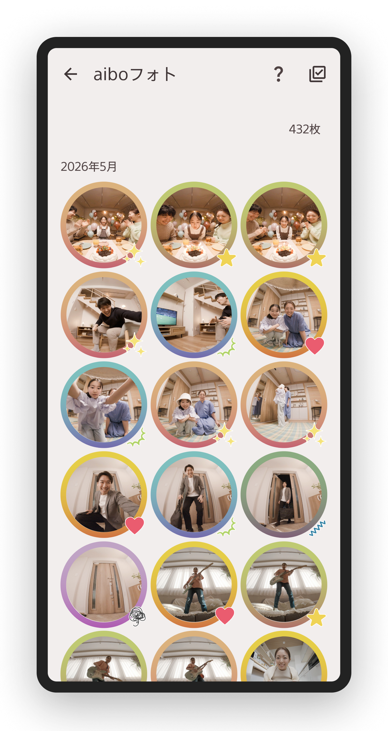 aiboが行ったふるまい、撮ってくれた写真などが記録され、日常の何気ない瞬間が、後から振り返ることのできる大切な思い出として残ります。
